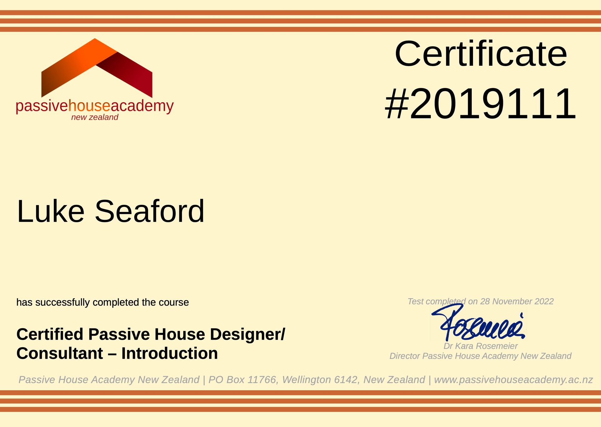 Luke has also been undertaking further study with the Passive house academy of New Zealand. Recently passing the certified passive house designer introduction course along with an additional course. The knowledge Luke has learnt allows his clients to have the option to design a high performance building. For more information please click on the link PHINZ or get in contact with Luke today to see how we can help with your next building.